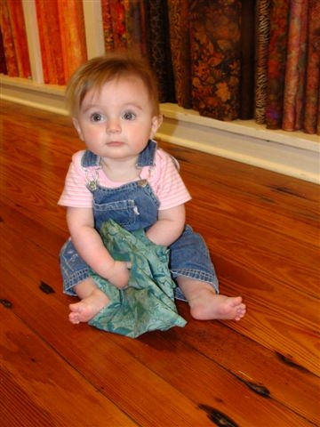 Emily Rebecca (6 months of age) on her first visit to Heirlooms and Comforts makes a selection from the collection of batik fabrics. She is the granddaughter of Barbara, a regular visitor to H&C Barbara. It is never too early to train youngsters about where to shop and to love fabrics.